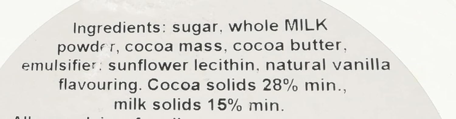 • Ingredients: sugar, whole MILK powder, cocoa mass, cocoa butter, emulsifier - sunflower lecithin, natural vanilla flavouring