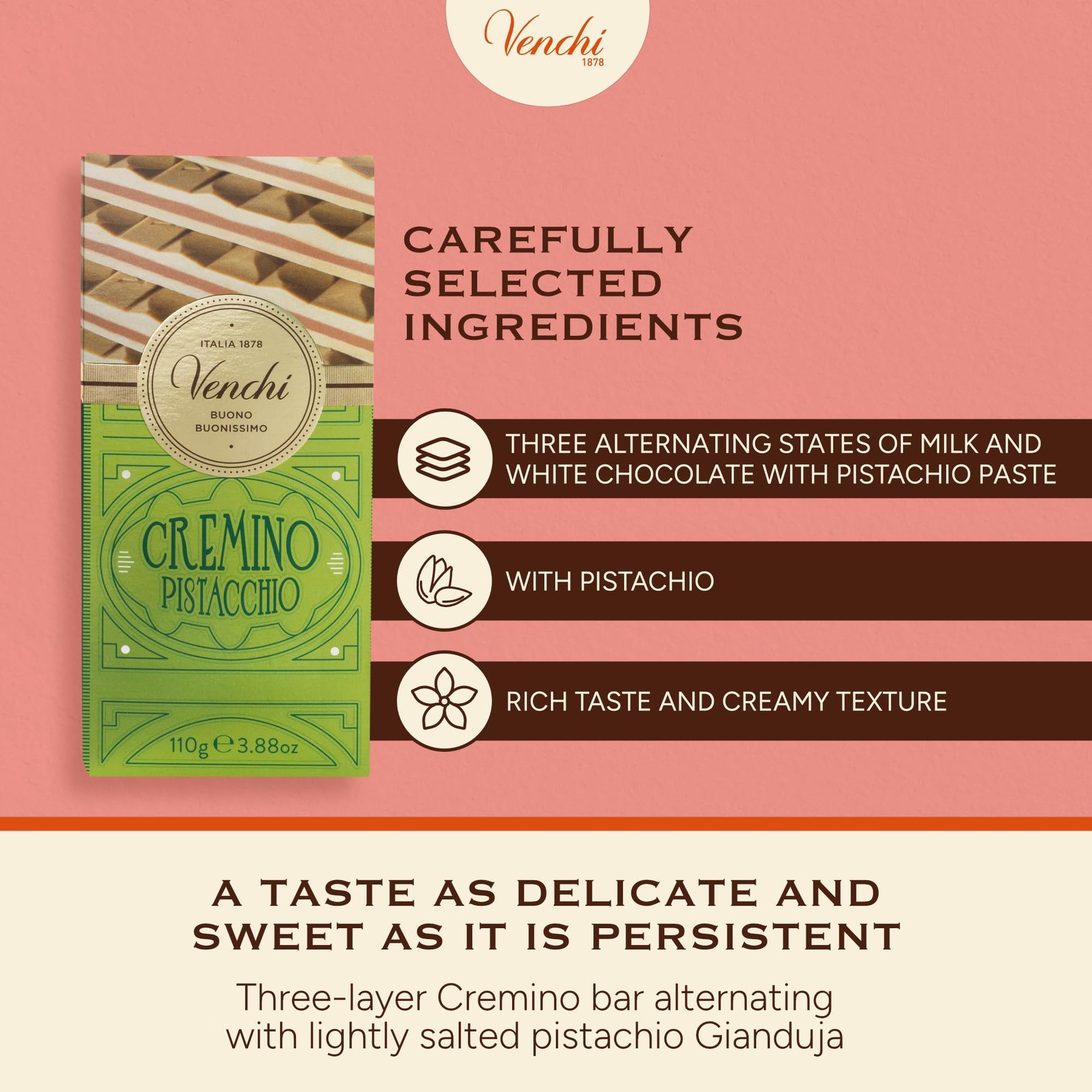 Experience the refined taste of Venchi’s artisanal chocolate-making tradition with every bite of this exquisite pistachio cremino bar.