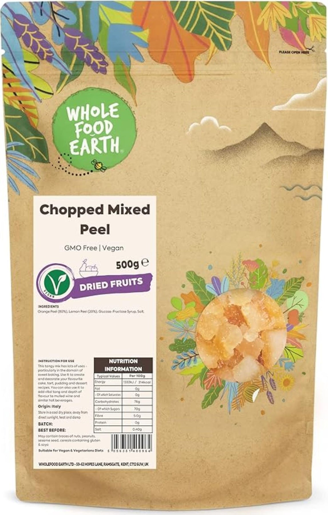 Wholefood Earth - Chopped Mixed Peel 500g | GMO Free | Vegan Friendly