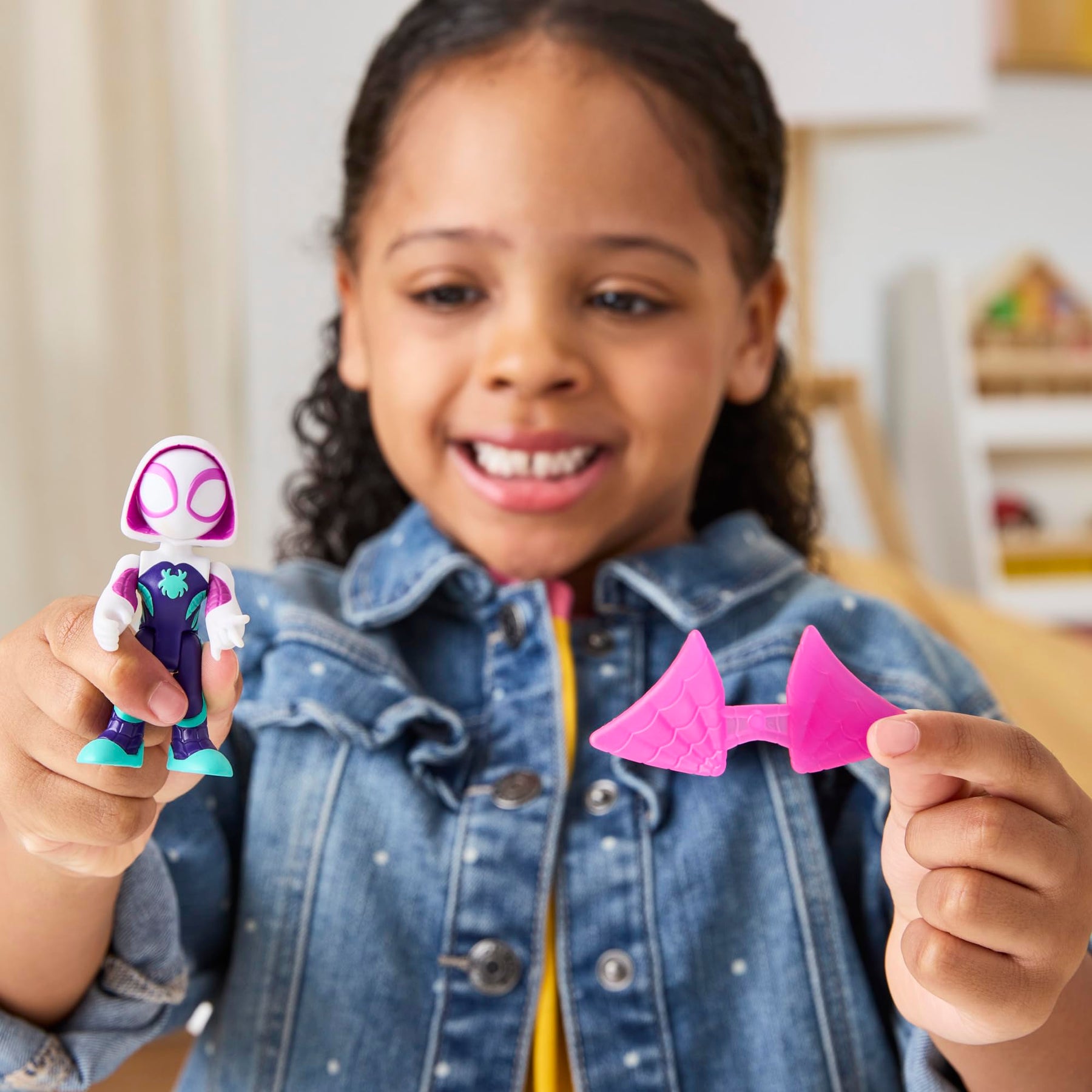 - 4 articulated Marvel action figures (Spidey, Miles 'Spin' Morales, Ghost-Spider, Green Goblin)