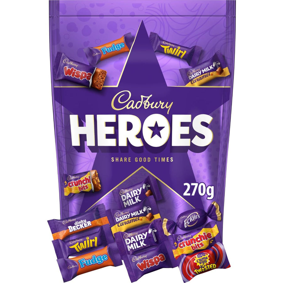 Cadbury Heroes is a beloved chocolate pouch filled with a variety of iconic miniature chocolate treats, perfect for sharing with family and friends. Ideal for festive occasions, gifting, or everyday snacking, this assortment brings together classic Cadbury favourites in one convenient, resealable pack.