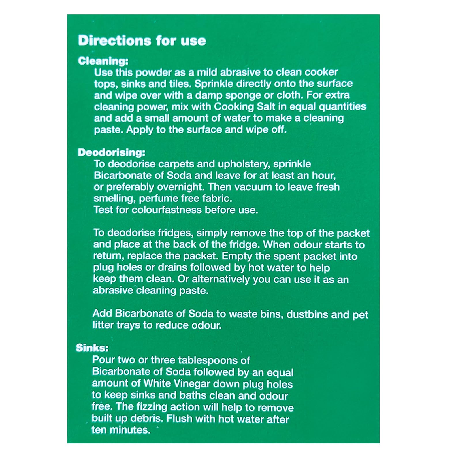 • For cleaning: mix with water to form a paste and apply to surfaces