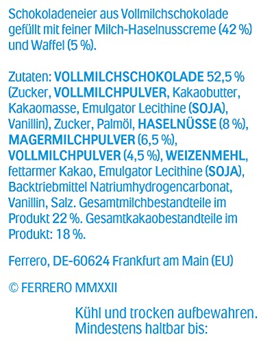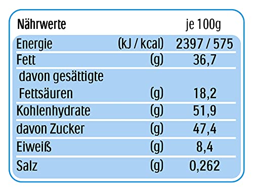 Ingredients: Fine MILK chocolate 52.5% (sugar, whole MILK powder, cocoa butter, palm oil), HAZELNUTS 8%, skimmed MILK powder, cocoa mass, WHEAT flour, emulsifier: lecithins (SOYA), fat reduced cocoa, vanillin, raising agent (sodium bicarbonate), salt.