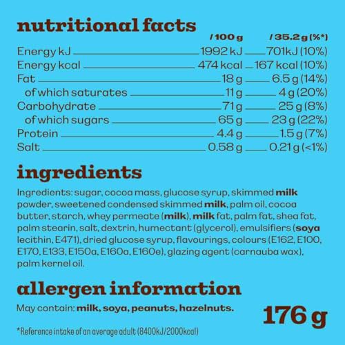 • Sugar, Cocoa Mass, Glucose Syrup, Skimmed MILK Powder, Sweetened Condensed Skimmed MILK, Palm Oil, Cocoa Butter, Starch, Whey Permeate (MILK), MILK Fat, Palm Fat, Shea Fat, Palm Stearin, Salt, Dextrin, Humectant (Glycerol), Emulsifiers (SOYA Lecithin, E471), Dried Glucose Syrup, Flavourings, Colours (E162, E100, E170, E133, E150A, E160A, E160E), Glazing Agent (Carnauba Wax), Palm Kernel Oil