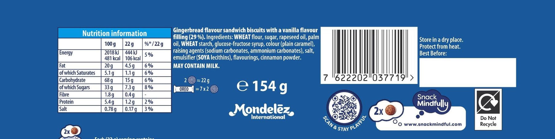 - LIMITED EDITION: Indulge in OREO's Festive Gingerbread Flavour Sandwich Biscuits, filled with Vanilla Crème for the perfect Christmas treat