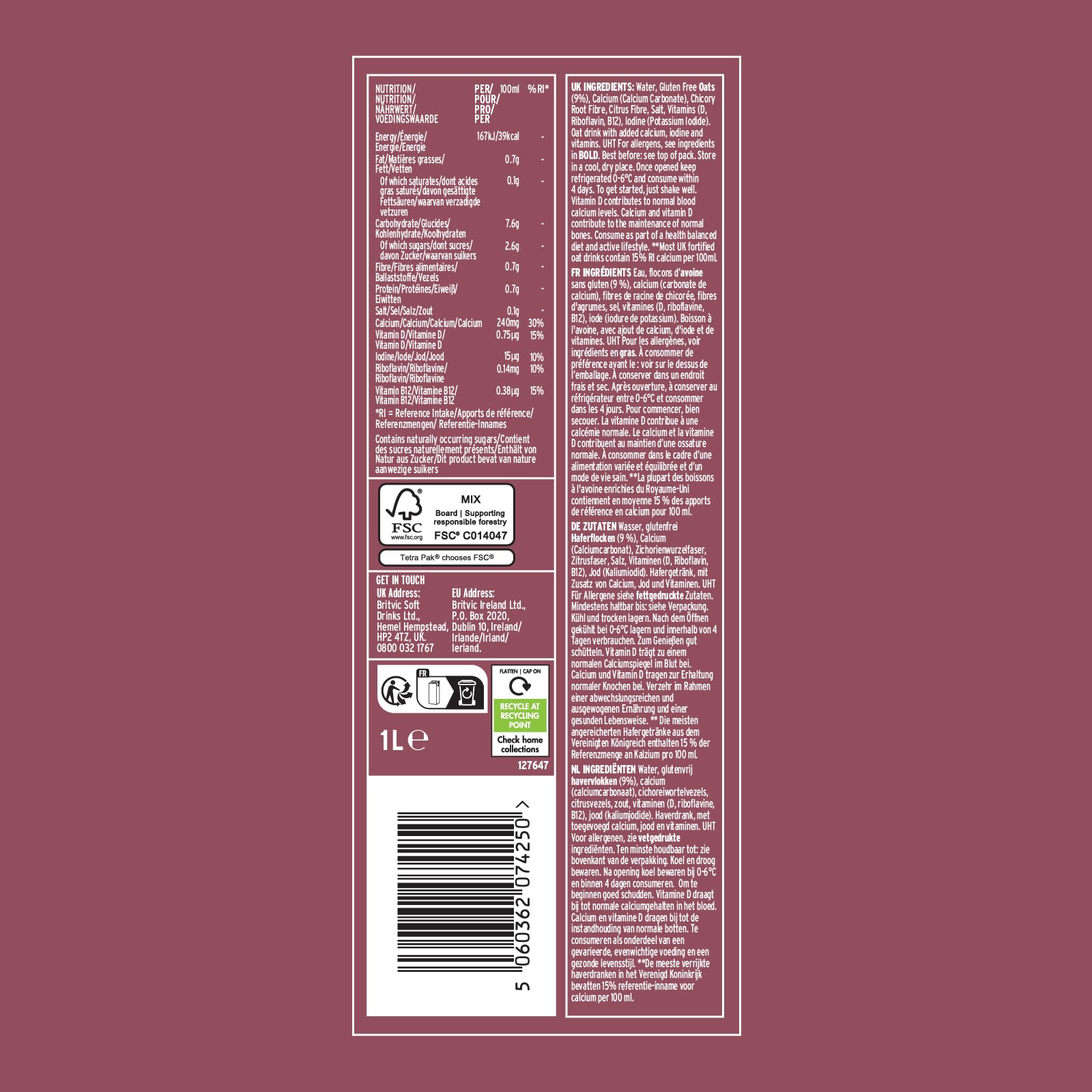 Ingredients: Water, Gluten Free Oats (9%), Calcium (Calcium Carbonate), Chicory Root Fibre, Citrus Fibre, Salt, Vitamins (D, Riboflavin, B12), Iodine (Potassium Iodide).