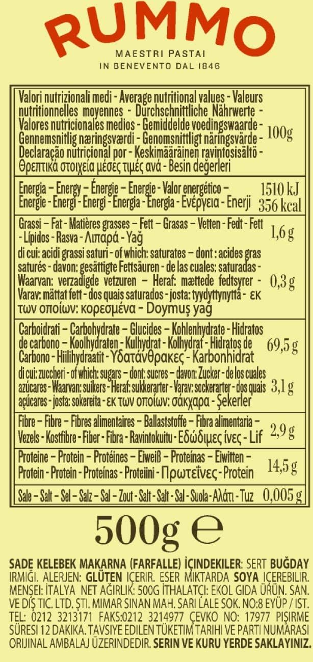 • Manufacturer: Rummo S.p.A., Via dei Grandi Maestri Pastai, 1 82100, Benevento, Italia